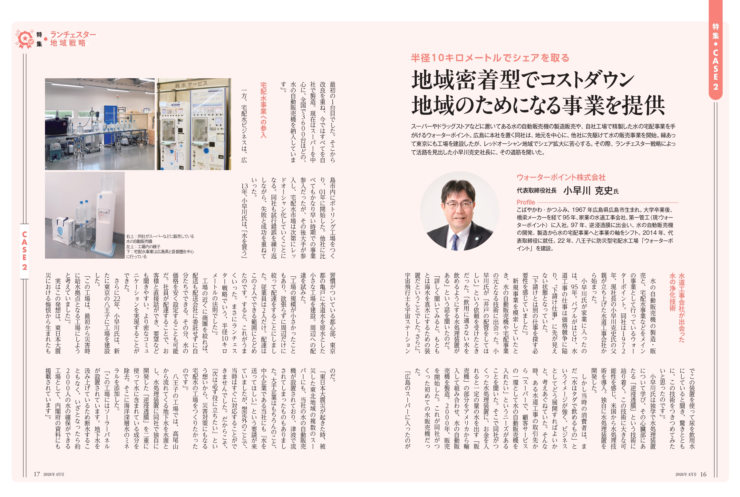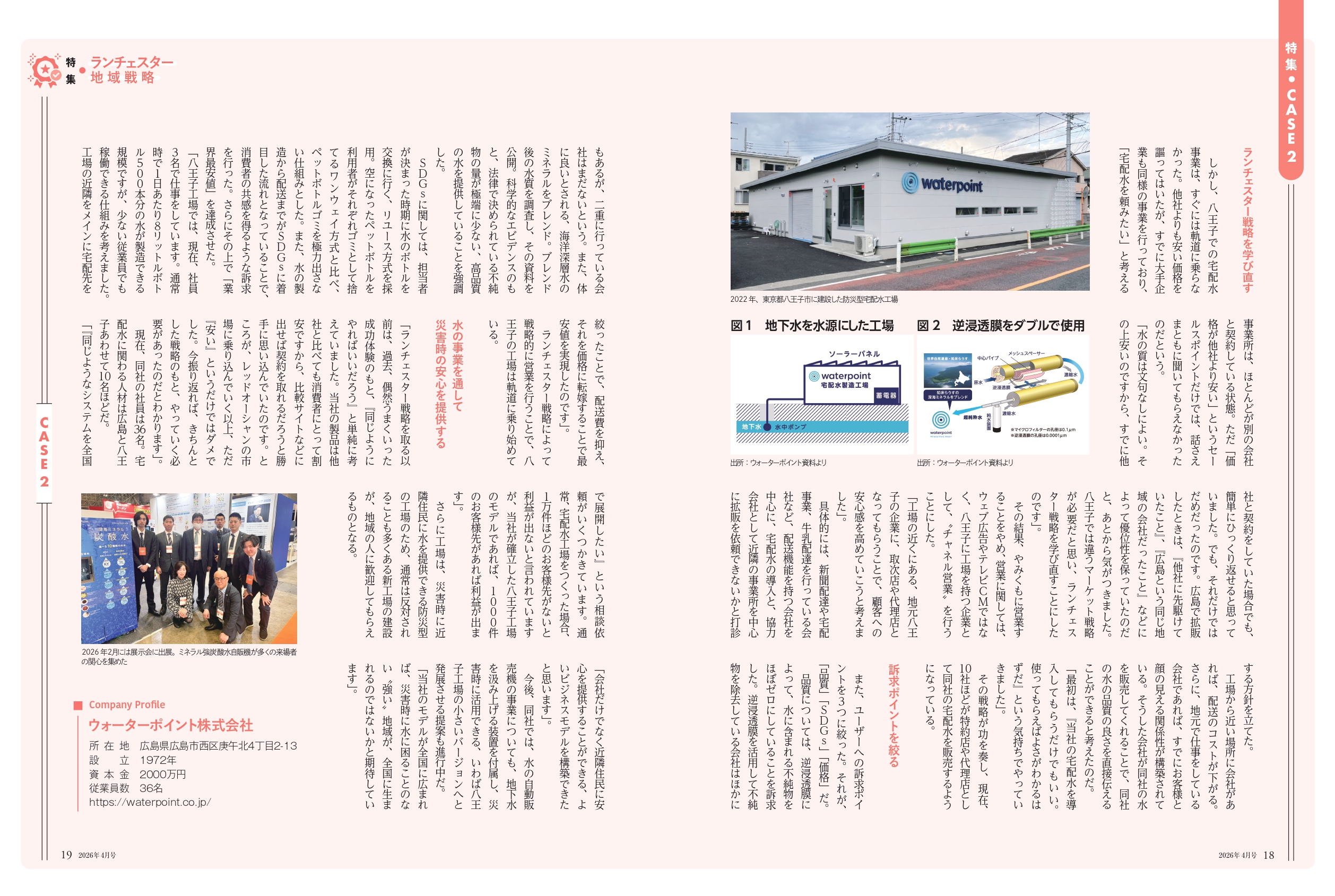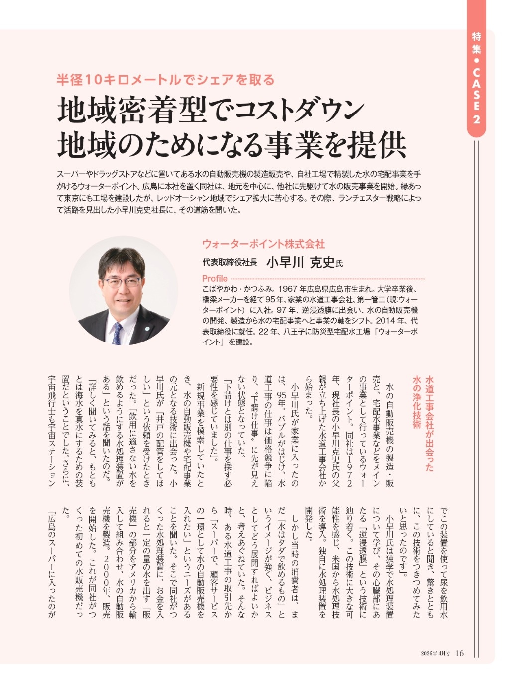 【メディア掲載】「次世代経営者」に掲載|地域戦略の取り組みが紹介されました この度、月刊誌「次世代経営者」2026年4月号にて、当社の取り組みが掲載されました。地域に根ざした事業展開や今後のビジョンについてご紹介いただいております。今後もより一層、皆さまに価値あるサービスを提供できるよう努めてまいります。 ウォーターポイント株式会社について 1972年創業の広島市水道局指定工事店です。水道工事業からスタートし、現在は水の自動販売機「深海の恵水(めぐみ)」や「ミネラルピュアウォーター」の宅配水事業を中心に展開しています。自動販売機は全国のスーパーマーケットを中心に約3,500台もの導入実績を誇り※、東京・八王子の宅配水工場からは災害にも対応できる水供給体制を築いてまいりました。「水で生活を健やかに、環境を豊かに」のビジョンのもと「安心・安全な水の創造」のミッションを掲げ、これからも“水のスペシャリスト”として本物の水を追求し、安心・安全なおいしい水をお届けしてまいります。 ※2025年4月時点 ・ウォーターポイント株式会社HPhttps://waterpoint.co.jp/・ウォーターポイント・ミネラルピュアウォーターLPhttps://wp-mkt.com/