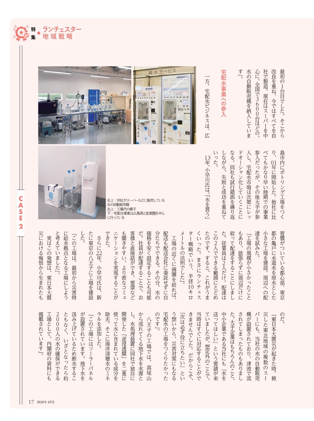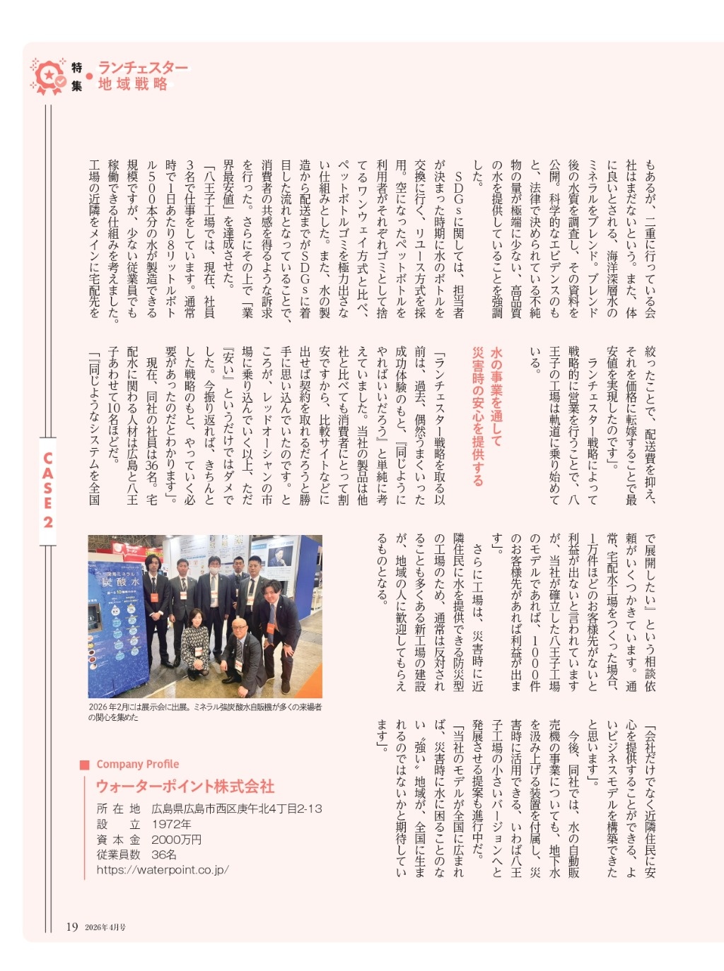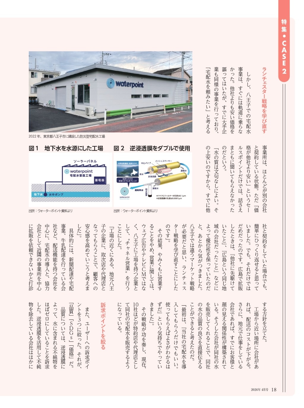 【メディア掲載】「次世代経営者」に掲載|地域戦略の取り組みが紹介されました この度、月刊誌「次世代経営者」2026年4月号にて、当社の取り組みが掲載されました。地域に根ざした事業展開や今後のビジョンについてご紹介いただいております。今後もより一層、皆さまに価値あるサービスを提供できるよう努めてまいります。 ウォーターポイント株式会社について 1972年創業の広島市水道局指定工事店です。水道工事業からスタートし、現在は水の自動販売機「深海の恵水(めぐみ)」や「ミネラルピュアウォーター」の宅配水事業を中心に展開しています。自動販売機は全国のスーパーマーケットを中心に約3,500台もの導入実績を誇り※、東京・八王子の宅配水工場からは災害にも対応できる水供給体制を築いてまいりました。「水で生活を健やかに、環境を豊かに」のビジョンのもと「安心・安全な水の創造」のミッションを掲げ、これからも“水のスペシャリスト”として本物の水を追求し、安心・安全なおいしい水をお届けしてまいります。 ※2025年4月時点 ・ウォーターポイント株式会社HPhttps://waterpoint.co.jp/・ウォーターポイント・ミネラルピュアウォーターLPhttps://wp-mkt.com/